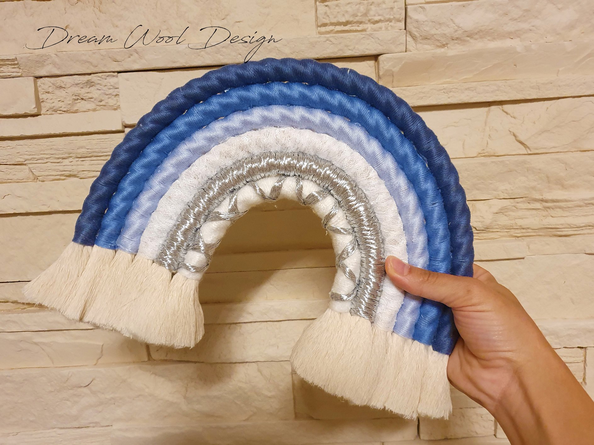Falra akasztható kisfiú makramé szivárvány, ezüst betéttel.