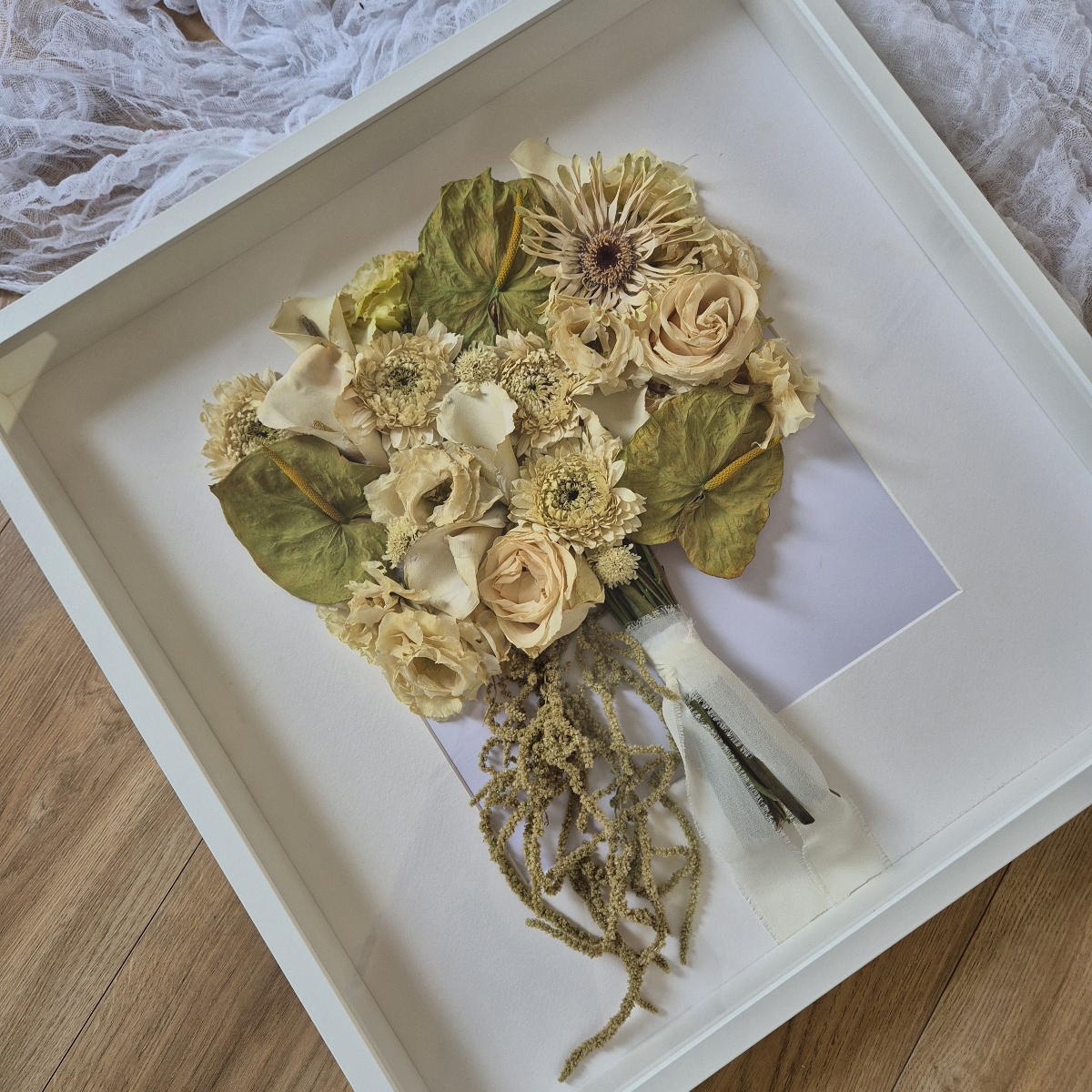 Menyasszonyi csokor megörökítés 50x50cm-es fehér vagy fekete képkeretben.