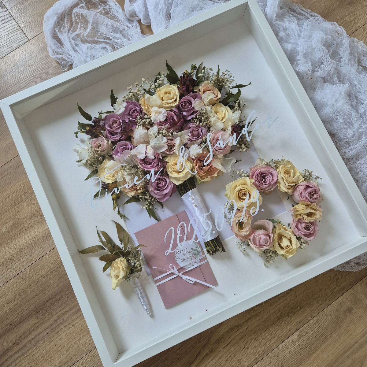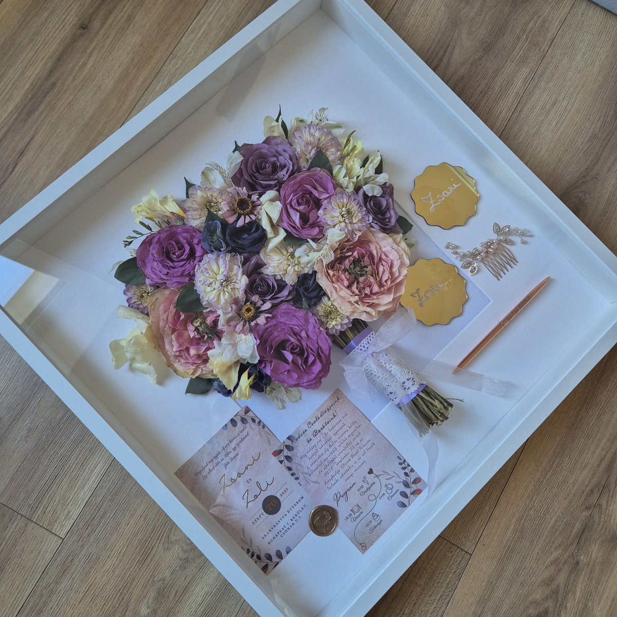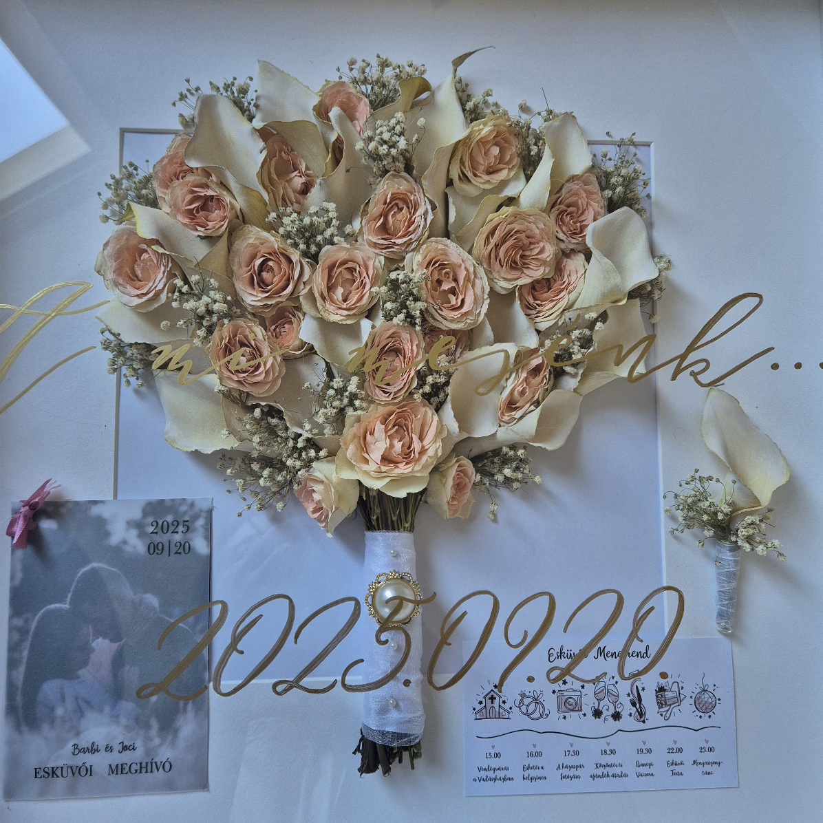 A tartósított esküvői csokor elkészítési/szárítási ideje kb 3-4 hetet vesz igénybe. Egyéb kiegészítőket is tehetünk a csokor mellé, akár a kitűzőt, hajtűt/koszorút vagy akár a szertartási lapotokat vagy meghívótokat is. Természetesen a papírok beillesztéséért nem kell külön fizetnetek. Minden más virágos kiegészítő felár ellenében kerül a keretbe. Felirat külön kérhető rá, ez lehet a nevetek, monogramotok, dátum, helyszín, stb.