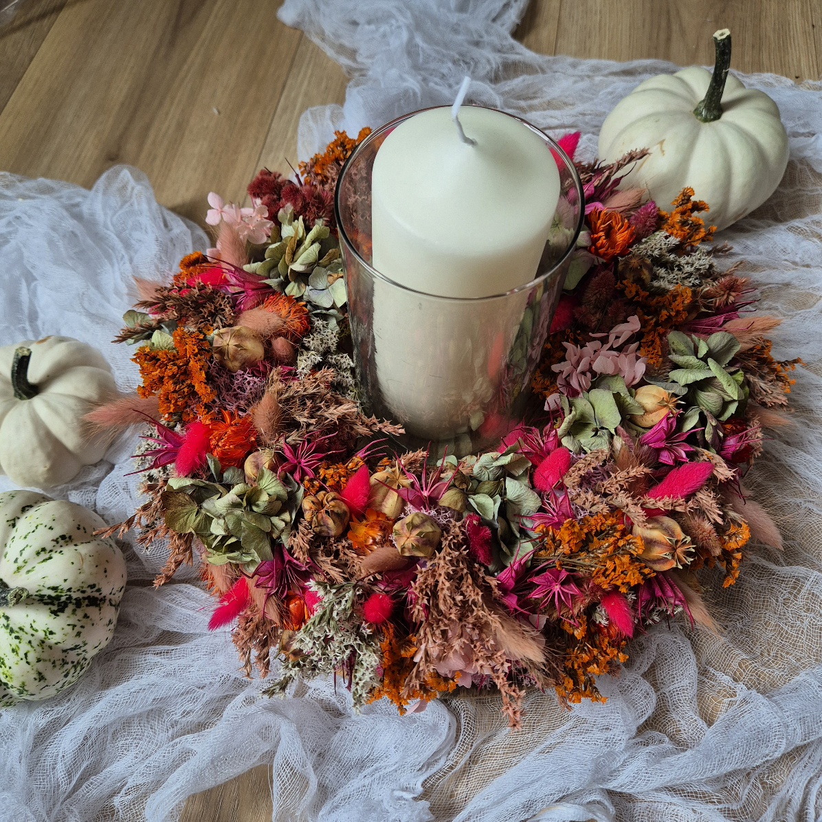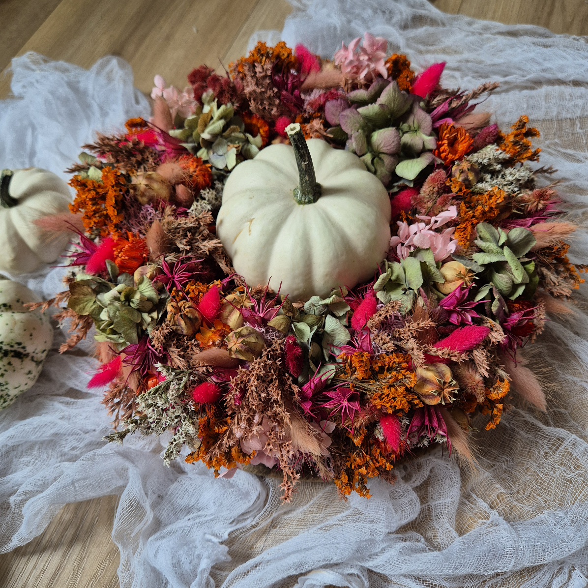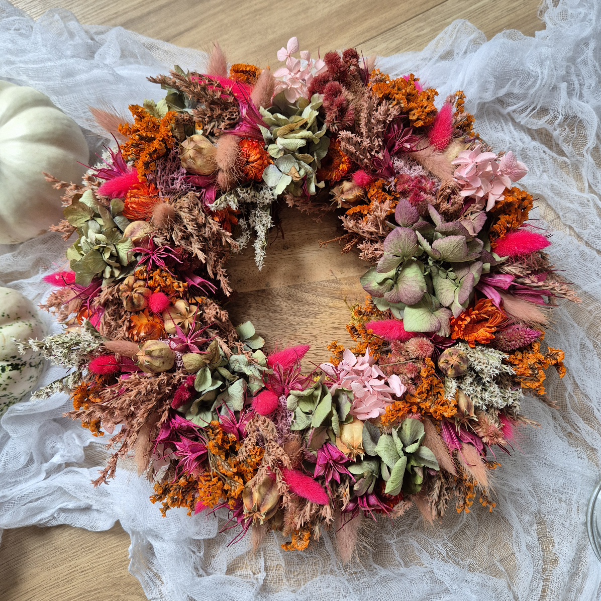 Szárított és tartósított virágokkal teletűzdelt őszies kopogtató, 25 cm szalma alapra készítve.
