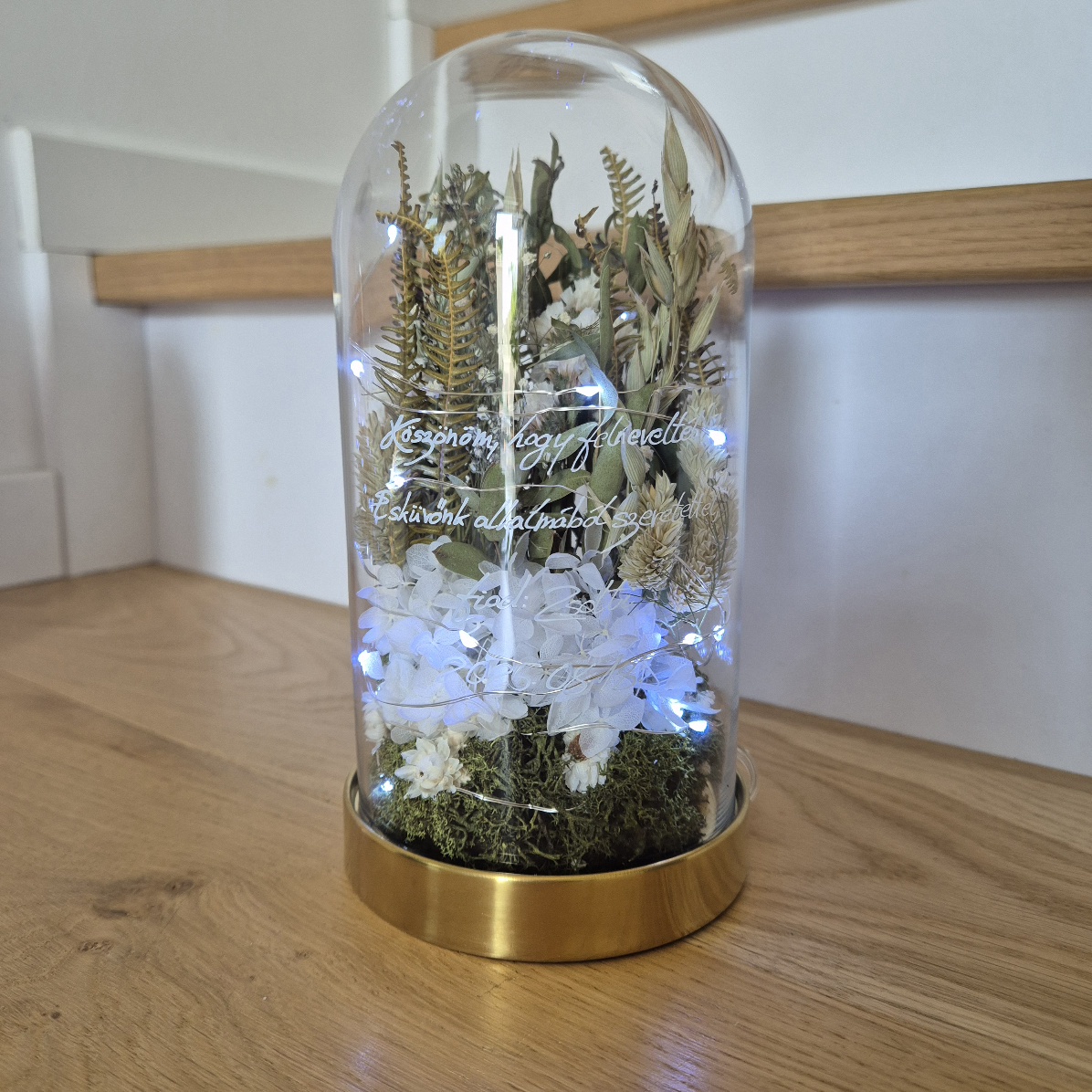 20 cm magas üveg búrába készített szárazvirág dekoráció, akár egyedi felirattal, bármilyen alkalomra. Tökéletes ajándék szülinapra, esküvőre, szülőköszöntő ajándéknak.