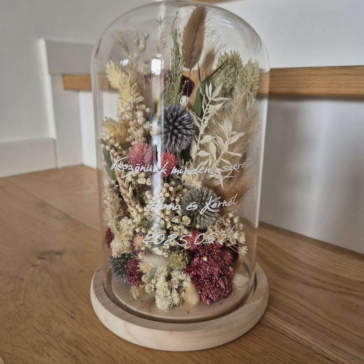 20 cm vagy 27 cm magas üveg búrába készített szárazvirág dekoráció, akár egyedi felirattal, bármilyen alkalomra. Tökéletes ajándék szülinapra, esküvőre, szülőköszöntő ajándéknak.